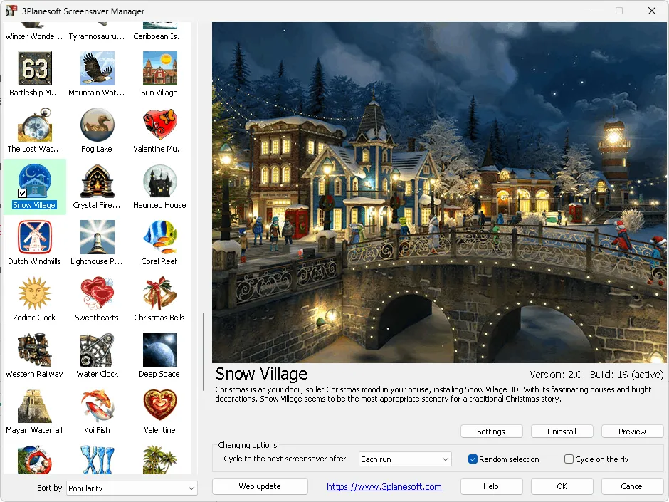 Launch the 3DPlanesoft Screensaver Manager, and then if you want to use a screensaver, such as “Snow Village,” all you have to do is make your selection in the left window and then close it.