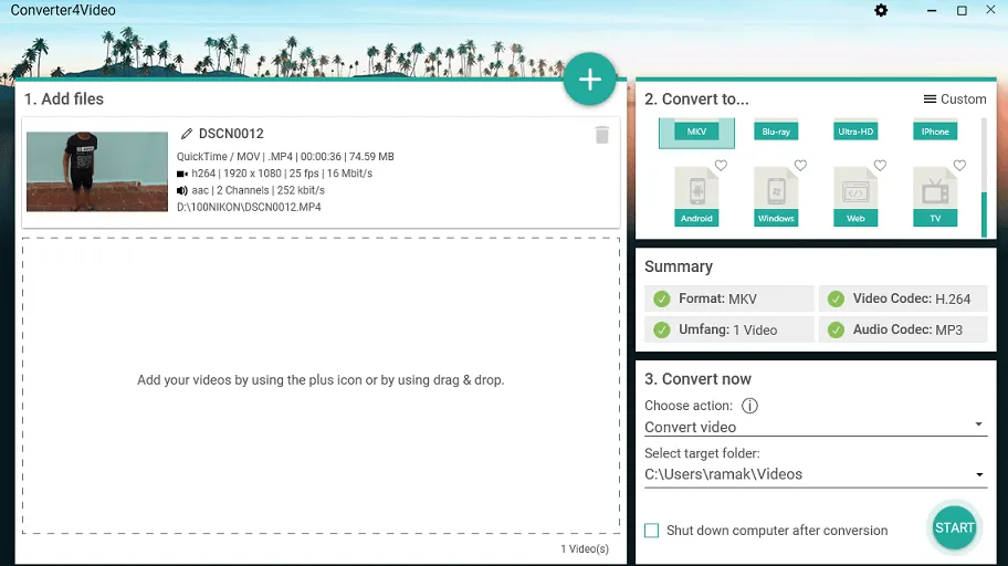 To get started, either drag and drop the source videos onto the main window of Converter4Video or use the built-in explorer to locate them on your computer and open them in the program. If you need to process multiple files at once, you can do so efficiently thanks to batch processing’s support.