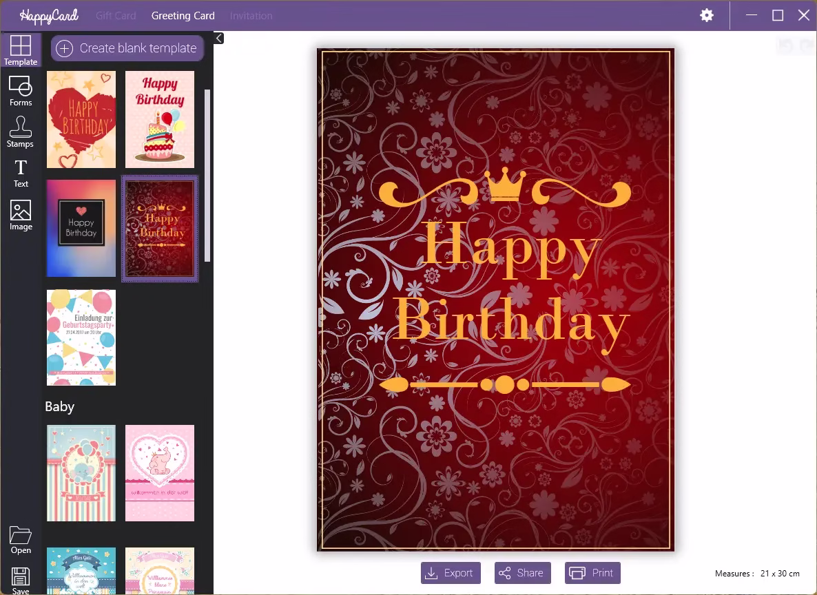 You can design gift cards and vouchers for your friends’ birthdays or other special occasions, including Christmas, as well as create birthday, baby welcoming, condolence, and thank you cards.