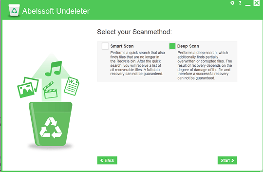 Abelssoft Undeleter 2016 supports two scanning methods – Smart Scan and Deep Scan (pro feature).