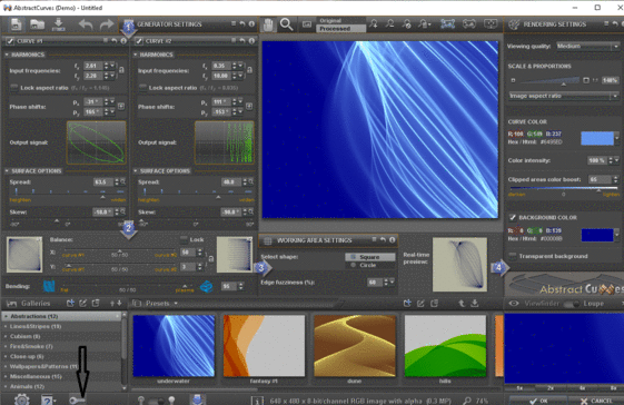 AbstractCurves is an abstract art generator or image creator that lets you make stunning posters or wallpapers in any resolution, or add effects, logos, or watermarks to your photos.