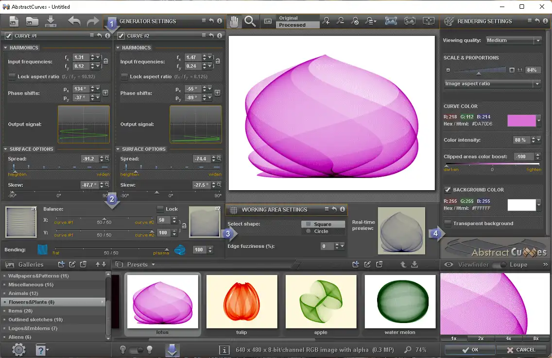By following the steps (1, 2, 3, 4) and making changes to the “Harmonics” of “Curve 1” and “Curve 2,” the “Surface Options,” the “Balance,” and the “Working Area Settings,” you will finish your design over time. Also, you can change the look of your own image by using the “Galleries” of “Abstractions,” “Lines and Stripes,” “Wallpaper and Patterns,” “Logos and Emblems,” and other effects.