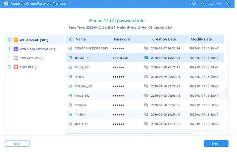 You have nothing to fear! No need to worry, Aiseesoft iPhone Password Manager is on your side. Using this application, you will be able to locate your Apple ID, iCloud Keychain, screen-time passcode, credit card information, Wi-Fi accounts, email accounts, Google passwords, applications, and more.