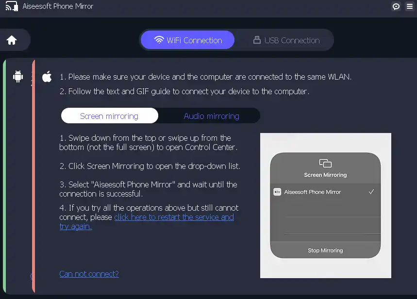 Aiseesoft Phone Mirror lets you choose from different ways to connect. It allows mobile devices and laptops to connect to each other through Wi-Fi. As an iOS user, you’ll need to make sure your phone and computer are on the same Wi-Fi network and activate Screen Mirroring to connect.