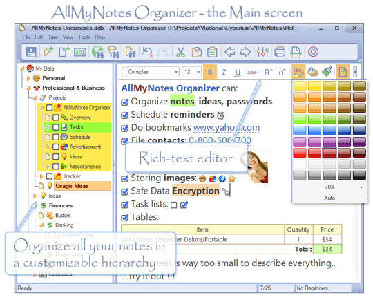 AllMyNotes Organizer Deluxe Edition comes with a hefty feature list. You can find a full list of features here.