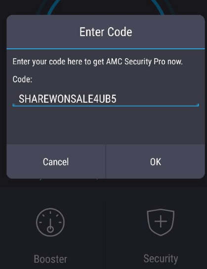 As the premium code is same for all users, you can simply download the AMC Security app from Google Play, launch the app and tap the ‘hamburger button‘ located at the top left of the main screen, then tap on ‘Enter code’ option and enter the premium code as SHAREWONSALE4UB5 and tap the OK button.