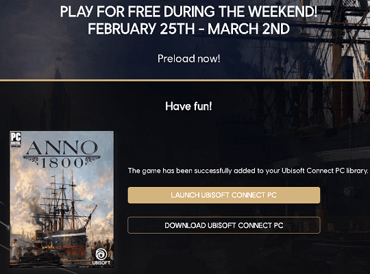Download and install Ubisoft Connect PC[115 MB], launch it, download the game and play it until 02/03/2021.