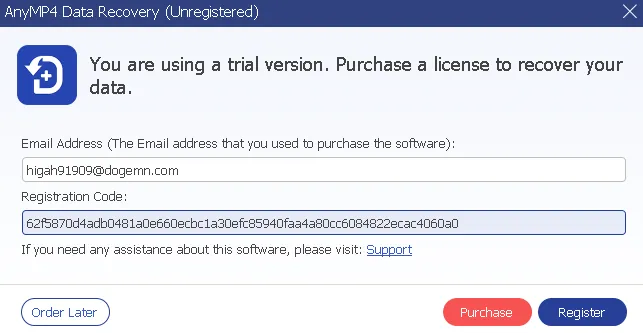 Check your email inbox. You will receive an email from “AnyMp4” (registration@anymp4.com). This email provides the registration code or license code.