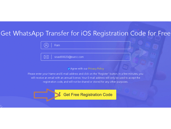 Enter your name, and email address, agree to policy terms (check the box) and click the “Get Free Registration Code” button.