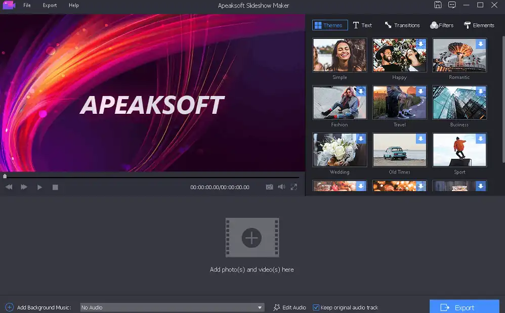 Apeaksoft Slideshow Maker is a professional video editing software that lets you make presentations with great pictures, audio recordings, and video clips. In addition, you can use pre-made themes and modify slideshow features.