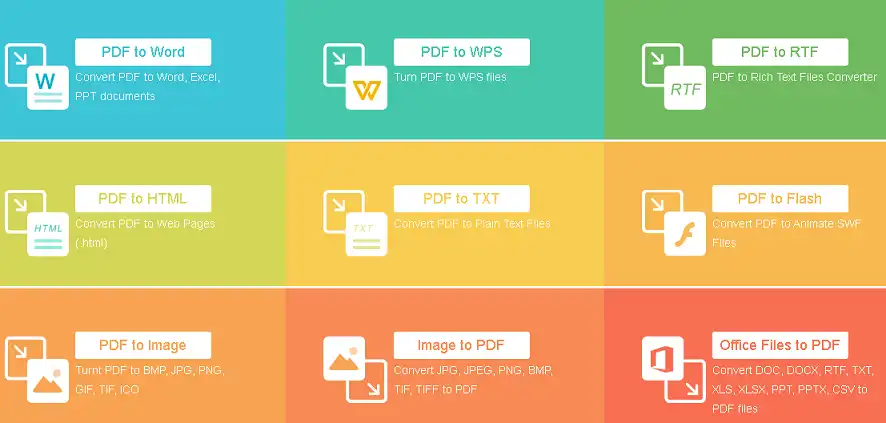 It is possible, for example, to convert PDFs to several other file types such as DOC and DOCx, PPT and PPTx and XLS and XLS, WPS and RTF and TXT as well as HTML and SWF. You may also use the software to convert PDF files to other popular image formats like BMP, JPG, PNG, GIF, TIFF, and ICO.