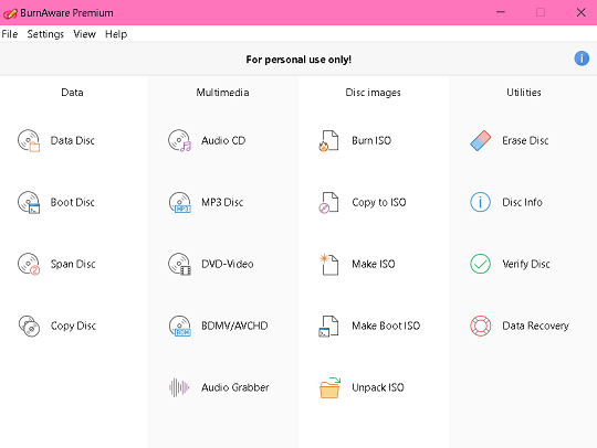 Unlike similar tools that come bundled with a load of advanced features, you’ll probably never use, BurnAware keeps things simple. All the available choices are accessible through a single