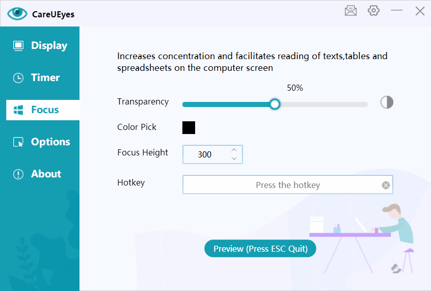 Spending long periods of time staring at a computer can result in eye fatigue. CareUEyes will alert us every hour to stand up or take a break to avoid vision problems or dizziness caused by prolonged sitting.
