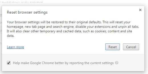 After this step, it will open the Chrome browser and asks you to ‘Reset browser settings’. Clicking the ‘Reset’ button will clear cookies, content and site data, also it will reset the browser search engine, the new tab page, and home page. Furthermore, it will disable add-ons on your browser and unpin all tabs.