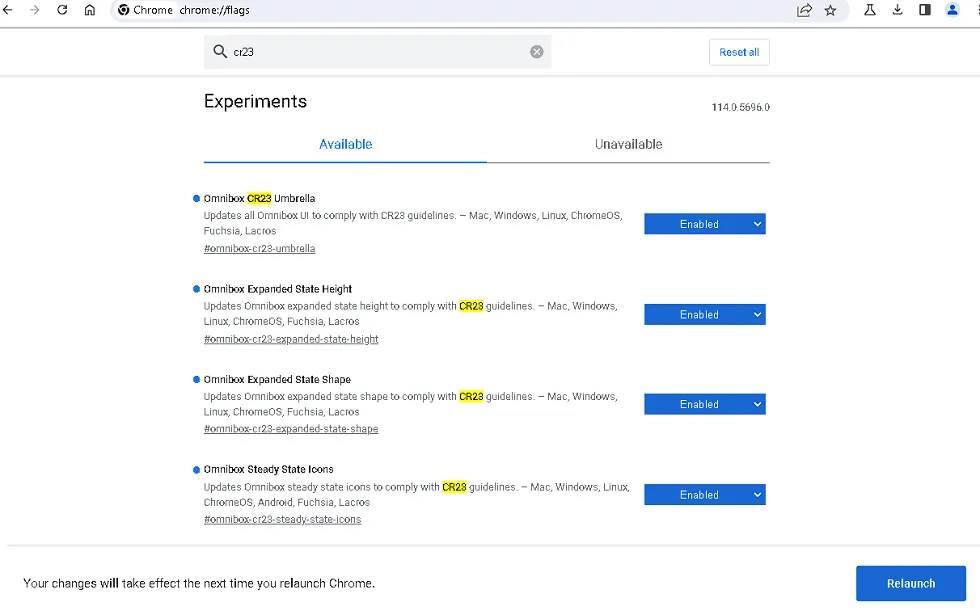 - Then, activate the following flags by searching for “cr23”:Omnibox CR23 UmbrellaOmnibox Expanded State HeightOmnibox: Expanded State Shape