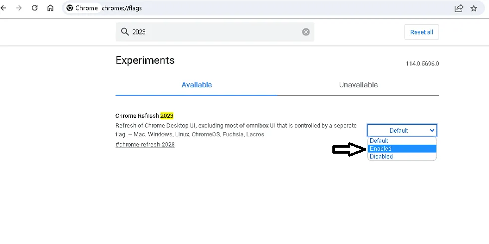 - Type “2023” in search bare and then click the enable switch next to “Chrome Refresh 2023.”