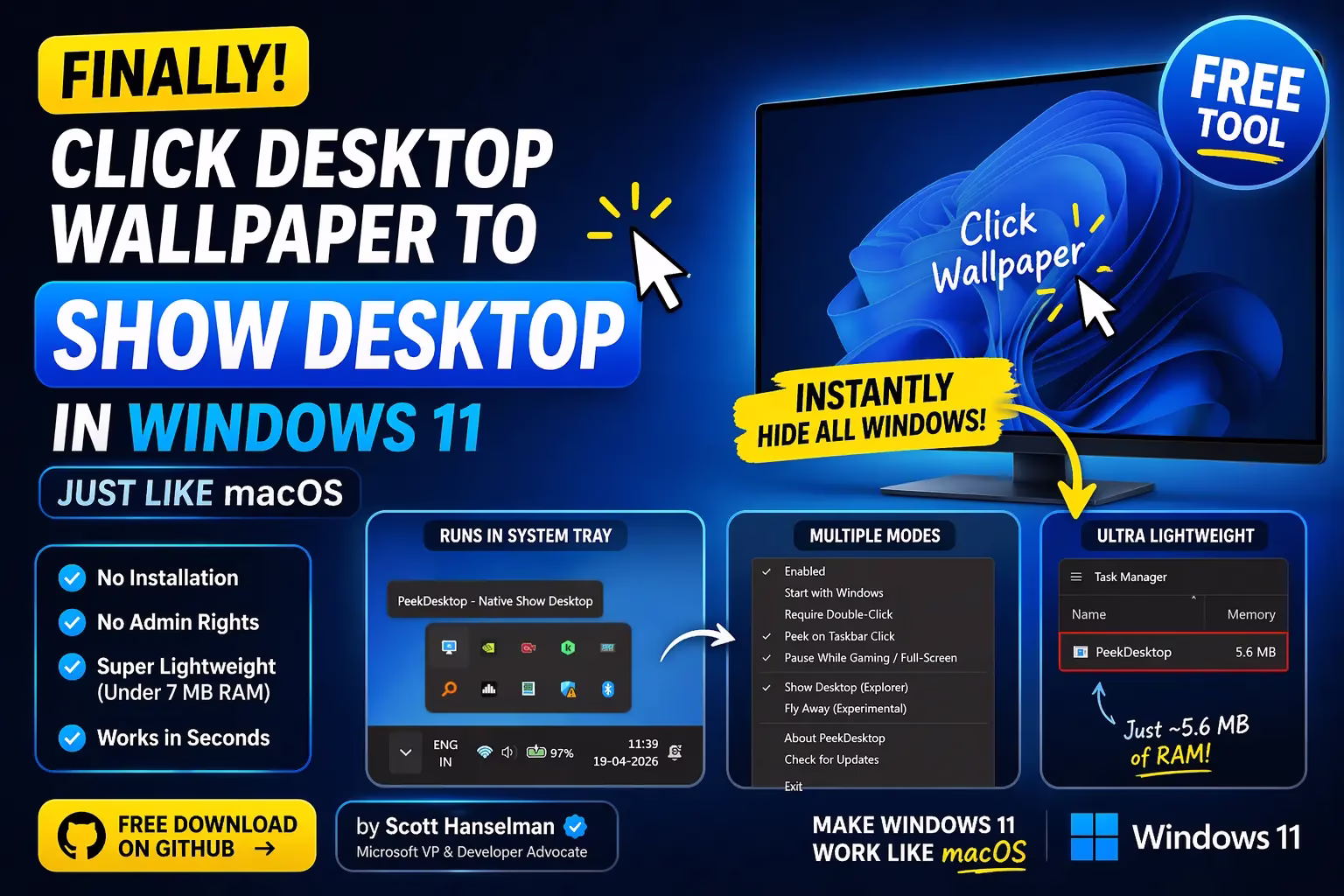 PeekDesktop is a free, open-source Windows 11 utility that adds macOS-style “click wallpaper to reveal desktop” functionality. It was created by Scott Hanselman, vice president at Microsoft, and released on GitHub under the MIT license.