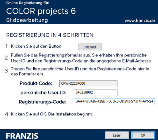 Next, you will receive a second email from Franzis. This email provides the activation details such as customer ID & Registration code (serial number).