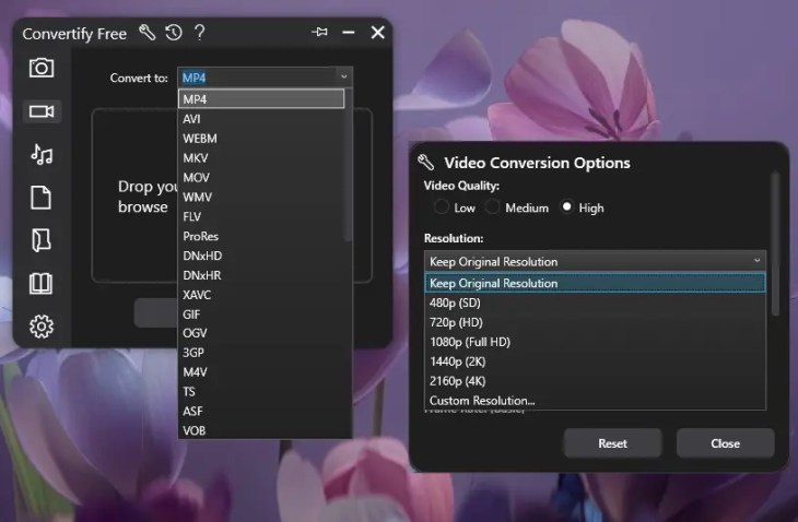 - Convertify Free (totally free): supports all major formats, AI to upscale images, themes, and has both basic and advanced settings.