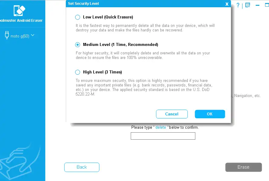 When it comes to security, the “High Level” option is the best and the most secure way to get rid of data is to write over it three times. This is based on the U.S. DoD 5220.22-M standard for security.
