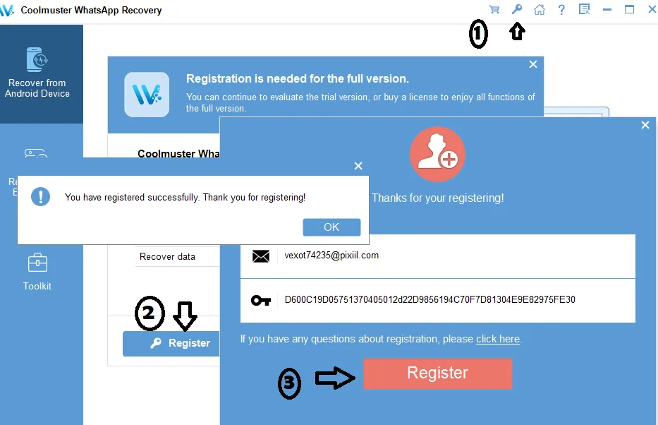 - This will launch the Coolmuster WhatsApp Recovery software; click the “key” icon, and next click “Register.”