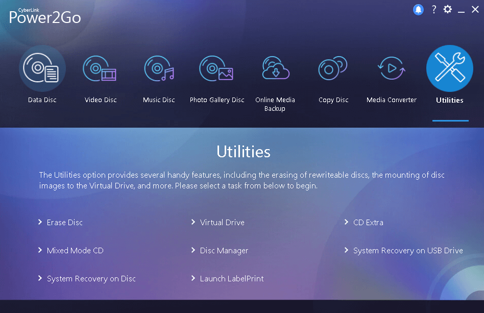 With CyberLink Power2Go you can create and burn data discs, music discs, photo gallery discs, and video discs.