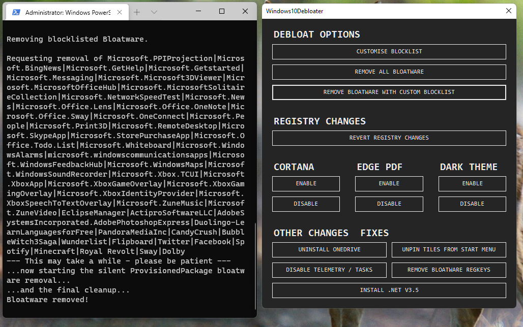 The Debloater will open once you run the command. First and foremost, if you do not use OneDrive on your PC, I recommend clicking “Uninstall OneDrive“.