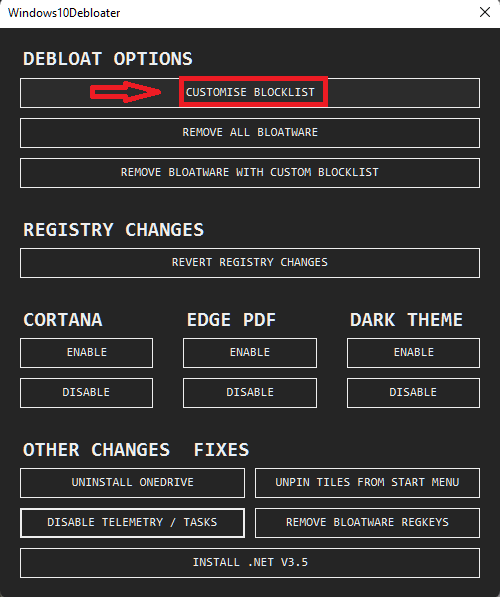 The most important step, debloating Windows 11 from unnecessary apps and packages. Click on “Customize Blocklist“.
