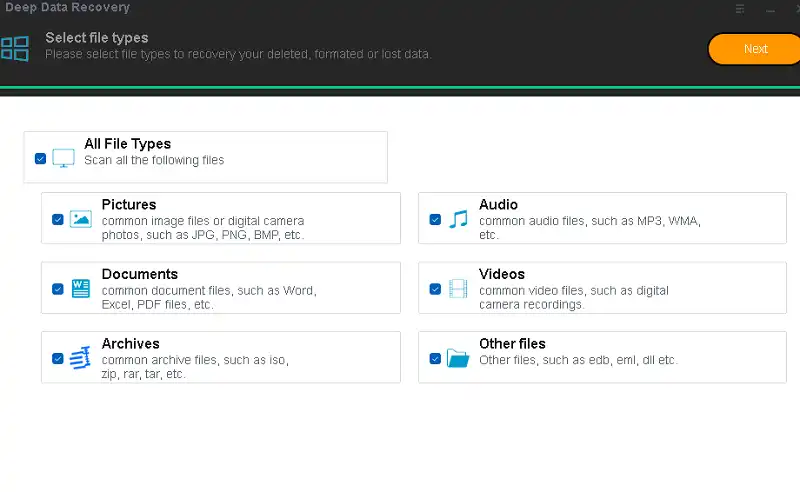 The main interface of the app will let you choose which types of files you want to recover. By default, all file types are chosen, but you can deselect them by checking the checkbox next to them (you can do this to narrow down the search and reduce the scanning time). Once you have chosen the file types you want to recover, click the button that says “Next.”