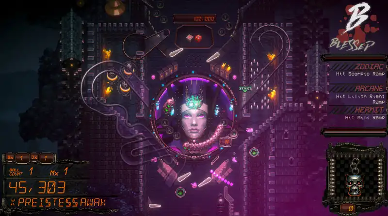 There is a pinball board that spreads across three screens, one for each of the three sections: Lilith, Hermit, and Zodiac. Most of the game takes place on the pinball board. They have different goals or items that help the player get a better multiplier score.