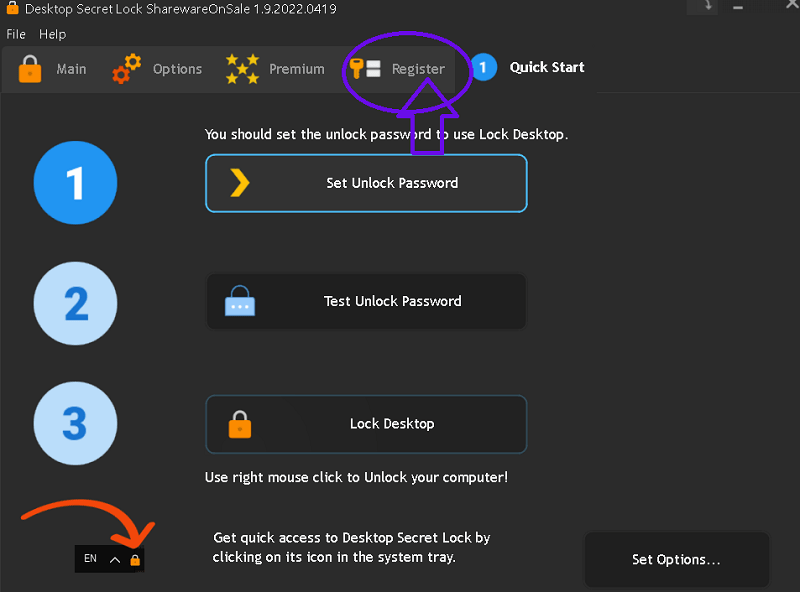 As soon as the installation is done, the QuickStart menu is automatically opened by the app. You can see the three steps that need to be completed before you can use the app from there. Creating a password for your desktop is the first step in the process. In the second step, your password is checked to make sure that you know it and can remember it. The third and last step locks your desktop.