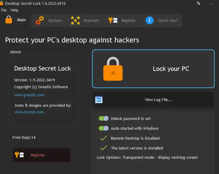 Desktop Secret Lock from Greatis software is a small yet strong application that protects against remote desktop hacking and unauthorized access.