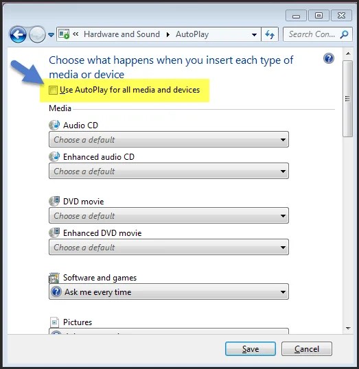 Now, just uncheck the option ”Use AutoPlay for all media and devices” and click the ‘Save’ button.That’s it, the annoying request message will be disabled.