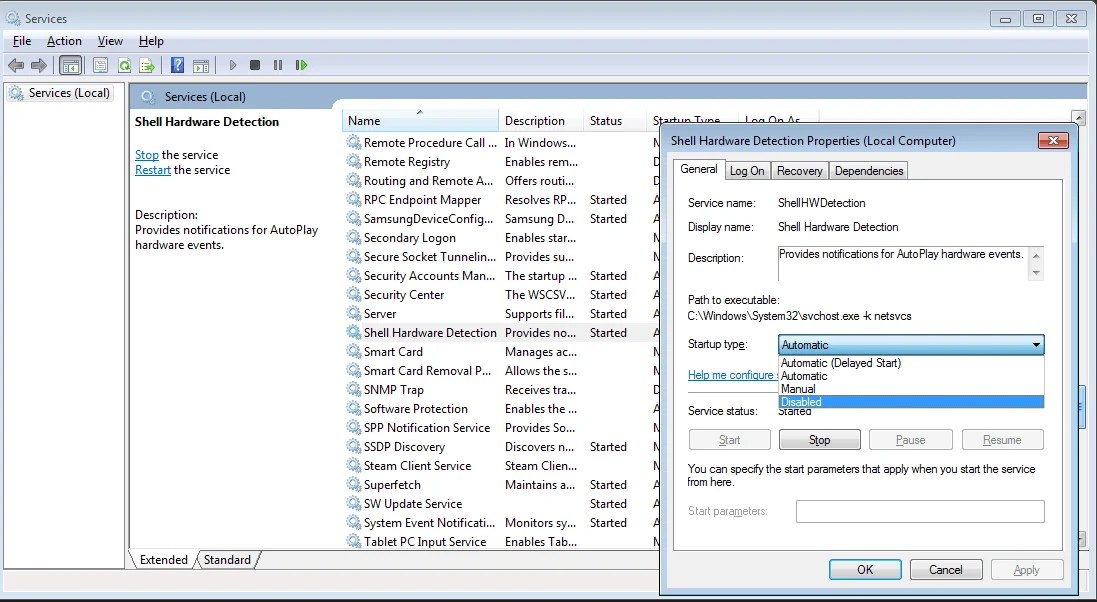 Now, you will see the Services Administration window, in that window look for ‘Shell Hardware Detection’ entry and double-click it, then select the option “Disabled” in the “Startup type” option.