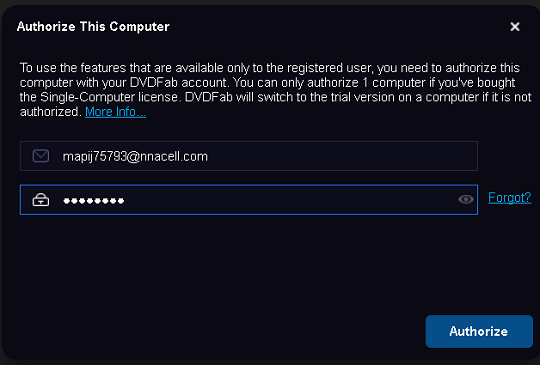 Enter your DVDFab account, email id, and password, and hit the “Authorize” button.