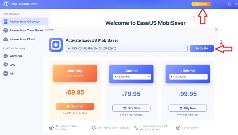 Install the software and launch it. On the main interface of the app, click the “Key” icon, input the license code, and then press the “Activate” button.