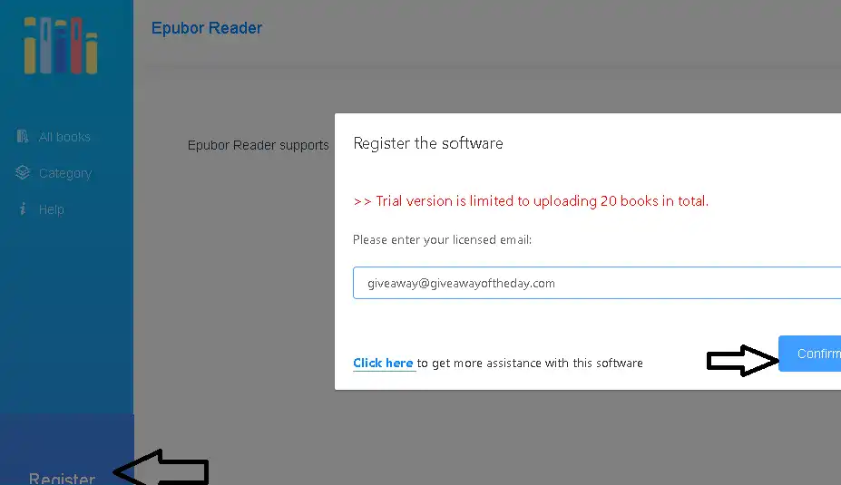 Install it and launch the app, on the main screen click “Register” and enter below email address.
