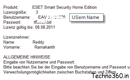 - Instantly you will receive an email from ESET which includes User Name (Benutzername) , password for ESET Smart Security Home Edition.
