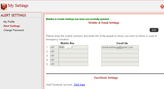 5.Now click “My settings” on Fightback webpage, navigate to “Alert settings“, here you can add your Facebook account and add mobile numbers for emergency contact, click “Edit” and add up to 5 mobile numbers. Also you can add contacts & Facebook account right from the mobile app.