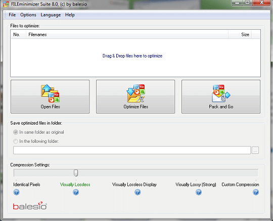 Just choose the files that you want to compress and select the compression strength  : low, standard, or strong . Th software  takes only a few seconds to compress each individual file.