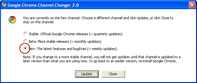 - Launch the channel switcher, and subscribe to the dev channel as shown below