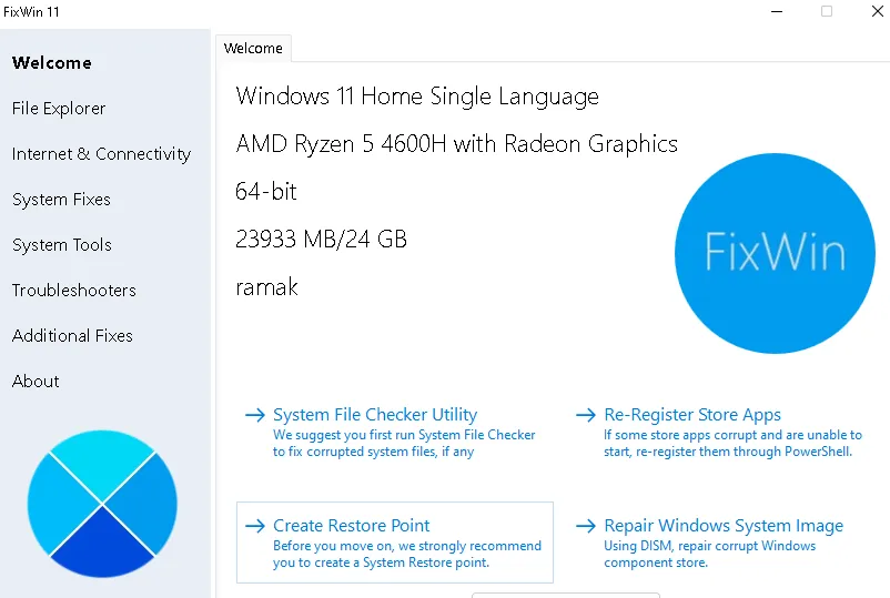 Before using this application, I advise creating a system restore point. As we are dealing with system maintenance and fixing errors, it is essential to have a backup available. To do this, you can either use Windows’ built-in tool or use the option available in the “Welcome” tab of the app.