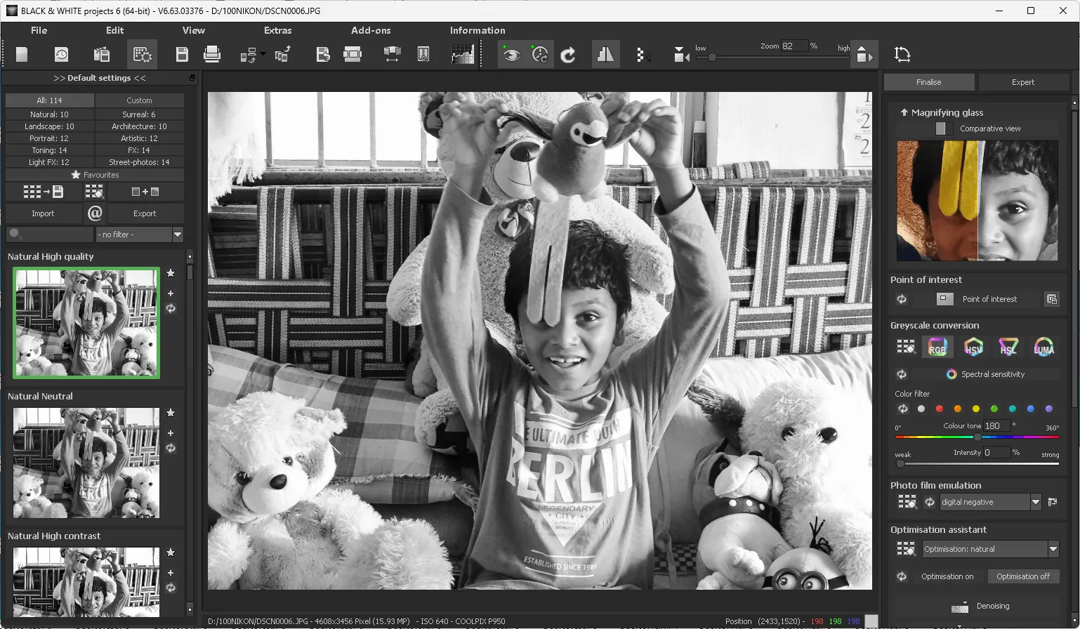 Seamlessly use this tool to give your photos a dramatic black-and-white effect that rivals Kodak, Fuji, and Ilford emulations.
