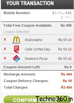 I’m using this service for last 2 months, I use to recharge above mentioned amount and I will select (get) coupons of Rs 500 worth, they will courier these coupons by charging RS 10 for the service.