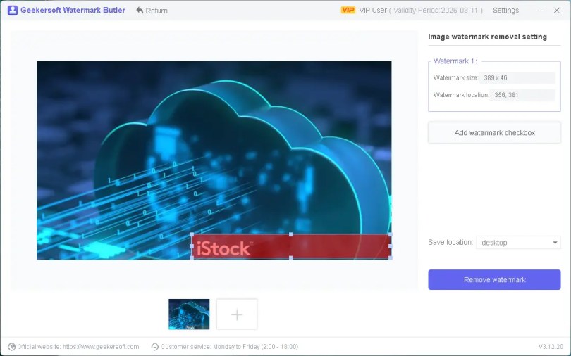 You can use the Geekersoft tool to both remove and add watermarks to your movies and images. Easily apply text watermarks to your photographs and videos. Size, color, transparency, angle of rotation, arrangement, flat spacing, and safe location are all customizable.