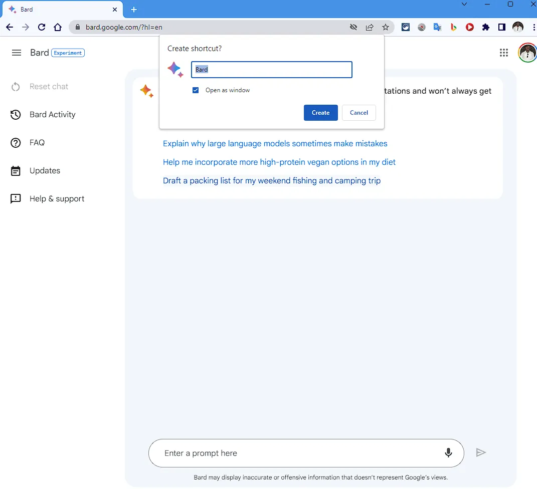- The popup will prompt you to give your shortcut a name. Simply call it “Bard” or “Google Bard” if you like. Make sure “Open as window” is selected, so the shortcut opens Bard in a new window rather than a new tab.