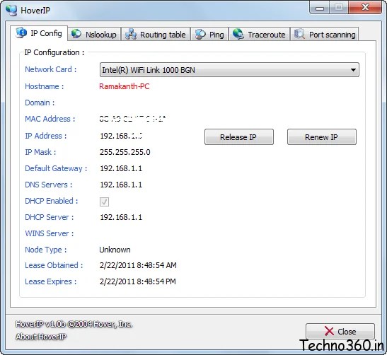Provides details about your Connected Network Card, IP address, Mac address, Default Gateway,DNS,currently assigned DHCP IP address and IP lease expiration information.