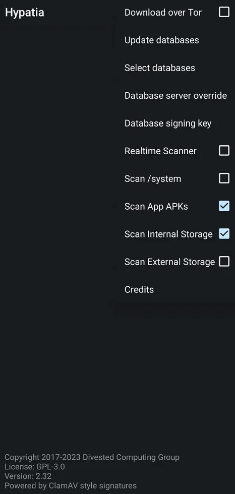 Hypatia is an Android malware scanner that is both free and open-source. It scans both installed apps and files on your device and is powered by ClamAV-style signature databases.