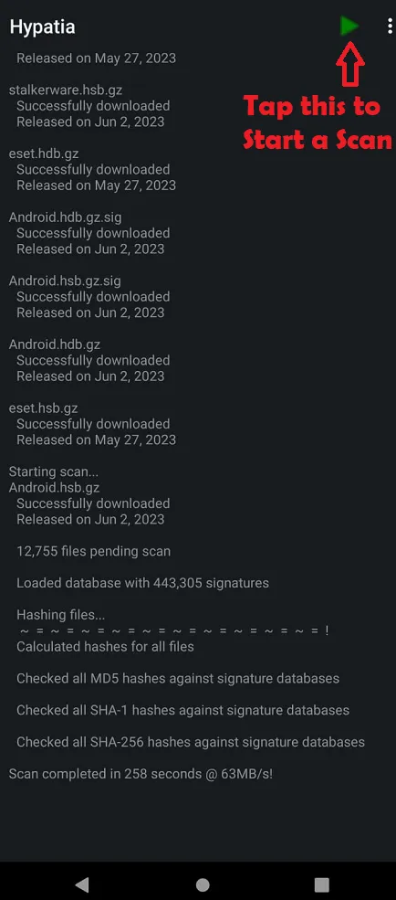 To initiate a scan, press the “Play” button. After checking the most up-to-date databases, it will scan your device for malware and report its findings.