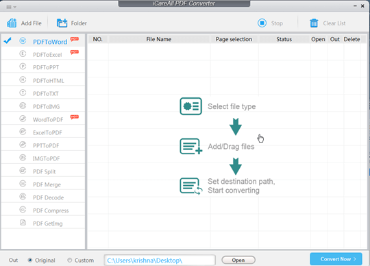 iCareAll PDF Converter has a clean & easy-to-use interface, the application has a simple layout with all the options arranged up-front so they’re easy to use. The left side pane has the list of all the operation that this tool can perform like ‘PDF to Word’, ‘Word To PDF’, ‘PDF Split’, and much more.